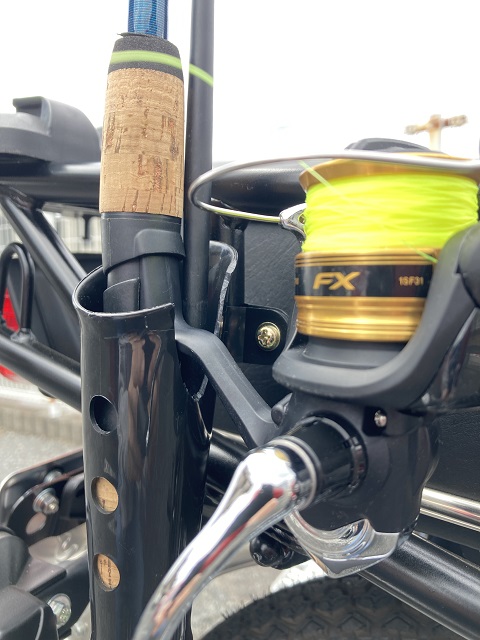 100円の傘ホルダー、バイク用釣り竿ホルダーとして、取り付け完了しました。リールをはめる溝はもう少し深く削って改良しました。