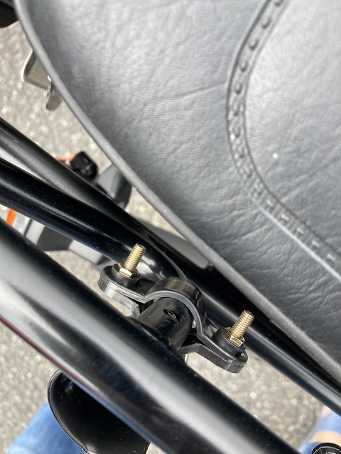 早速、先日黒く塗装したリアキャリアに取り付けてみます。ごついごつい、ごつすぎると思っていたリアキャリアですが、このホルダーを取り付けるためではないかという位置に、ちょうど縦の部分があるので、そこに取り付けます。